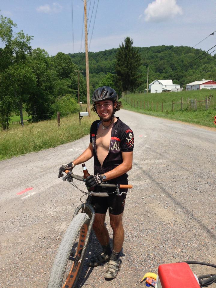I pull into the parking lot in Morgantown about a half hour before the race start. It’s totally packed. This is awesome. There are probably almost 300 people here. Register, go to the ladies bathroom with Garth Prosser, then pump up my fat tires. The rear starts to hiss and go flat. Shit. JR is already doing the prerace meeting. I run around begging for Stan’s, find some, inject it, and seal the hole.