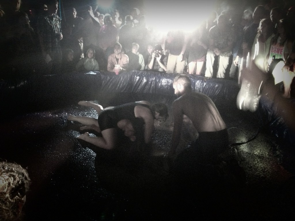 A set of halogen work lights are shining on a blue tarp covered pit full of jello. Music is blasting into the dark hills, and the entire town is standing around the pit. A guy skips around the edge of the ring with a little white garbage bin full of money.