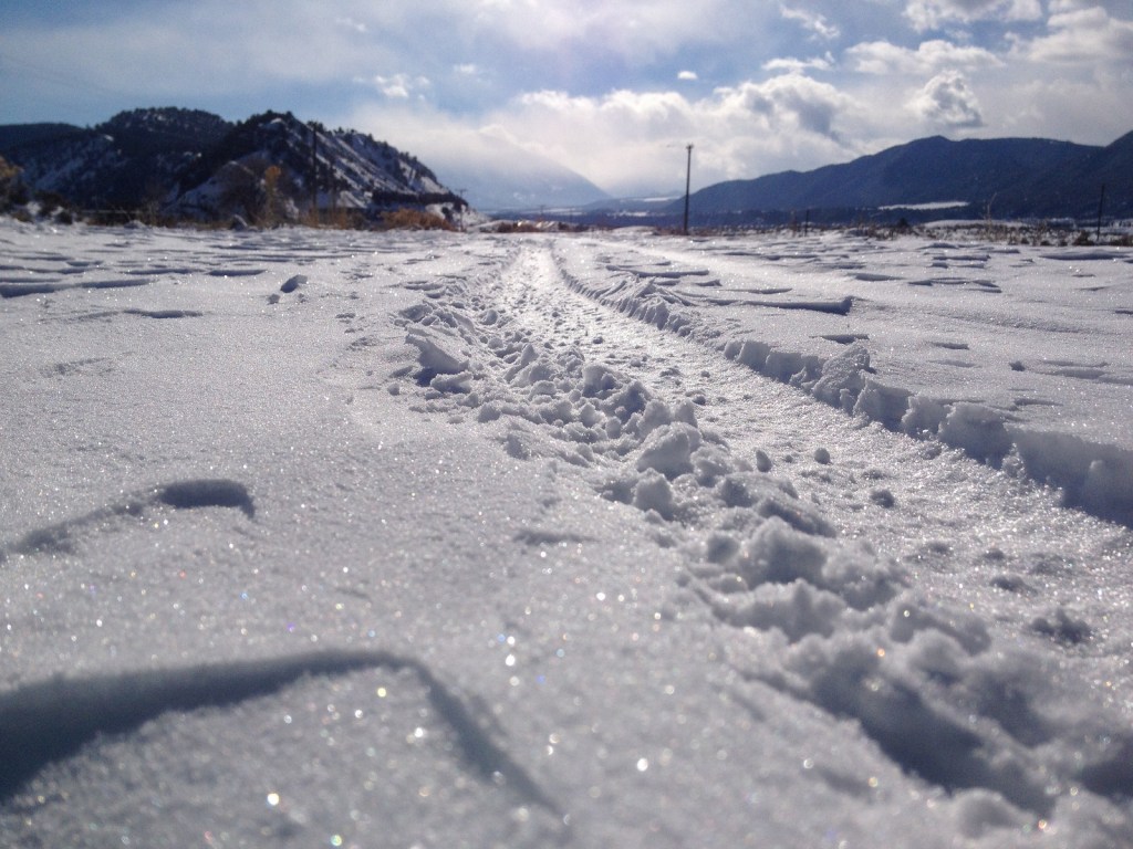 After we stayed in Carbondale Friday night for a party, Colleen rode home the next morning after it snowed all night. She was not happy. The easy spin that usually takes an hour took her twice that long, and she was all over the place on her 29er. She’s decided not to that again unless she’s on a bike with bigger tires.