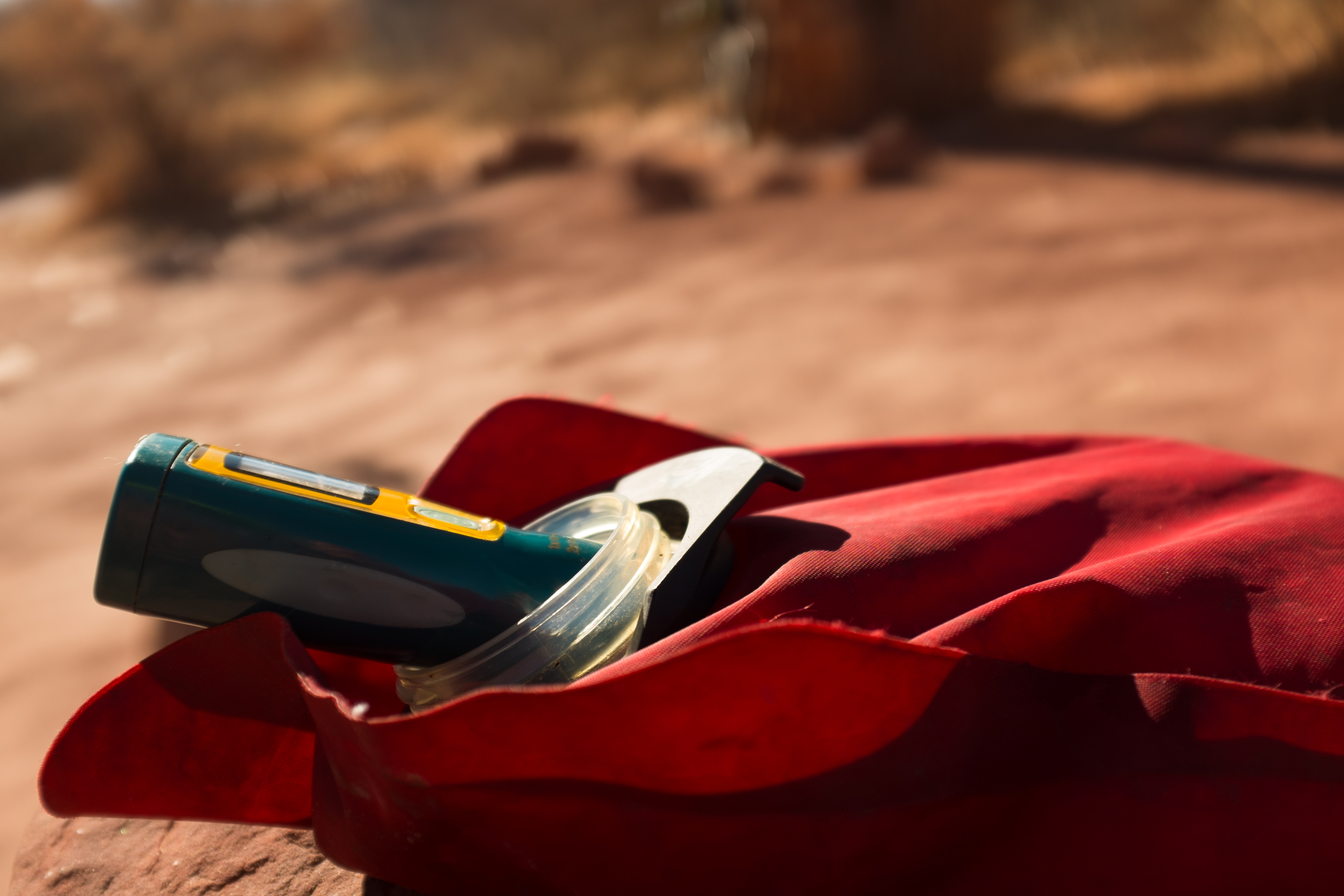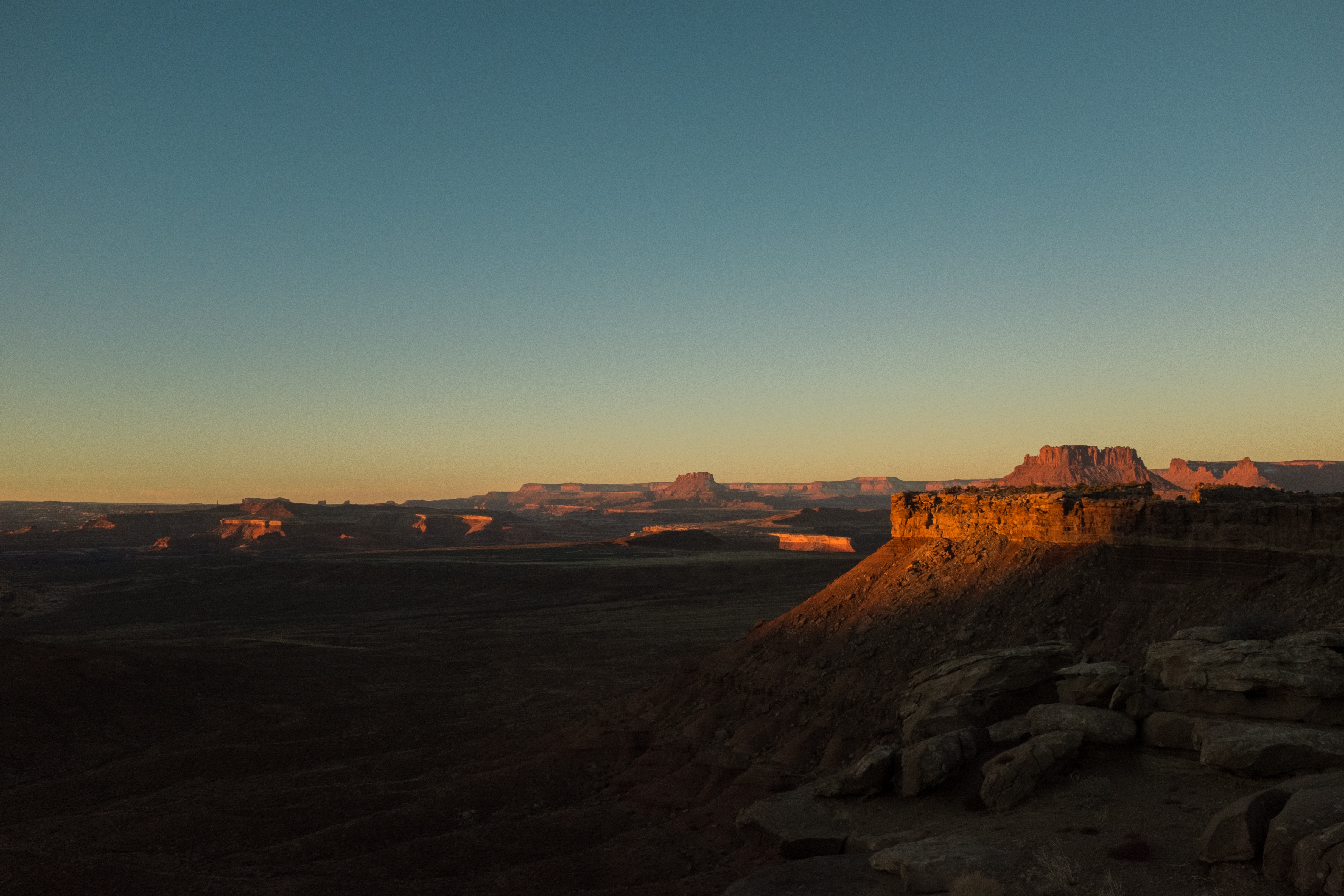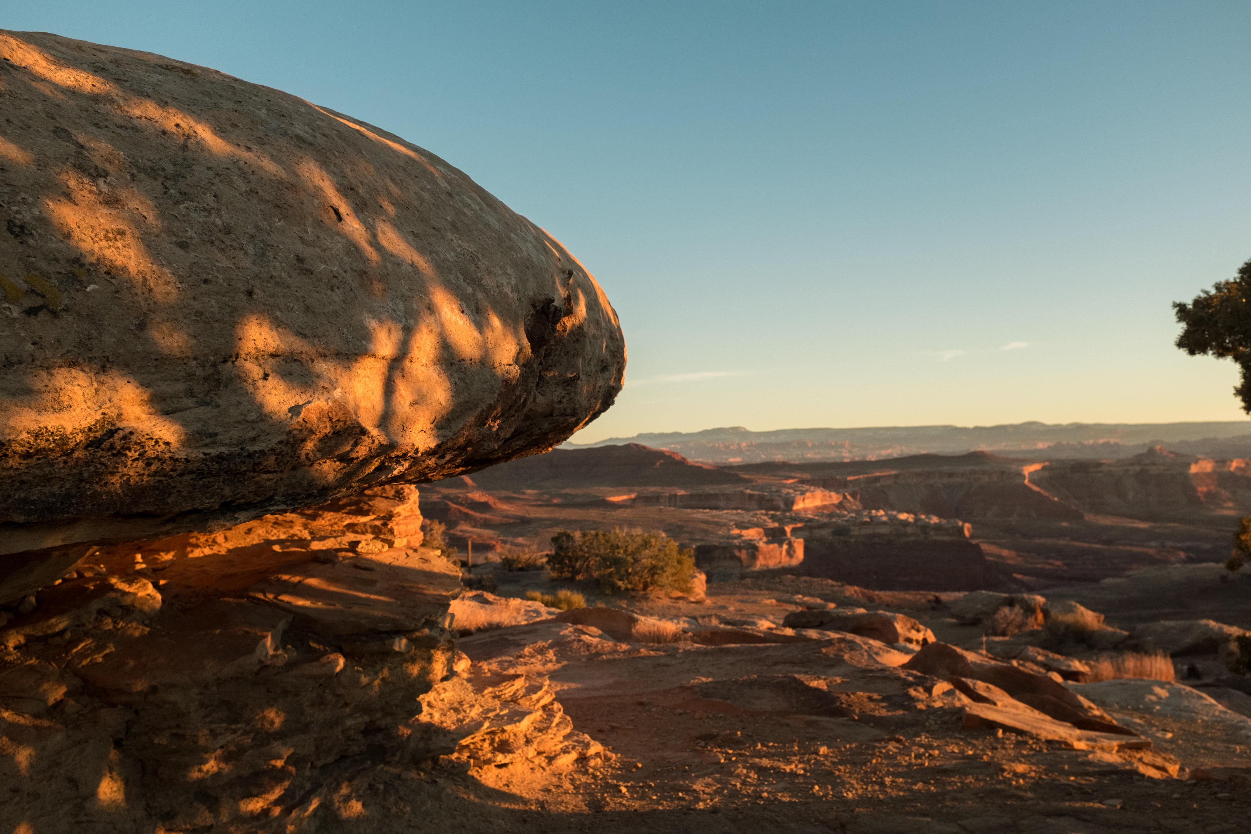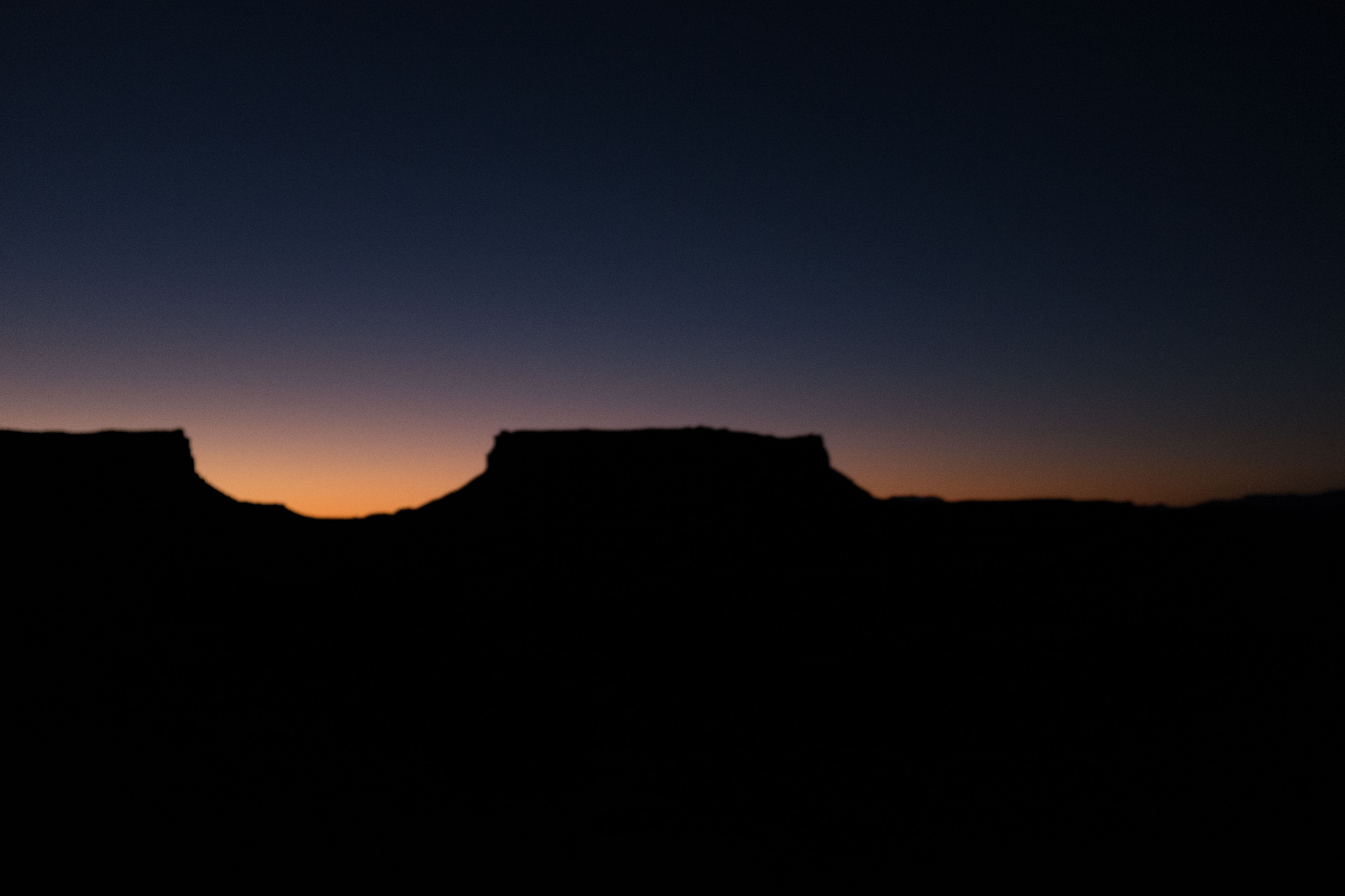 “Oh, looks like about 17 miles.” I cut a off big chunk of salami and set on the red boulder. The plan was to make it to Potato Bottom, where we could filter water from the Green River. Didn’t look like that was going to happen. But that’s fine. It was sunny, sweater weather, and we had the loop to ourselves. We could take our time.