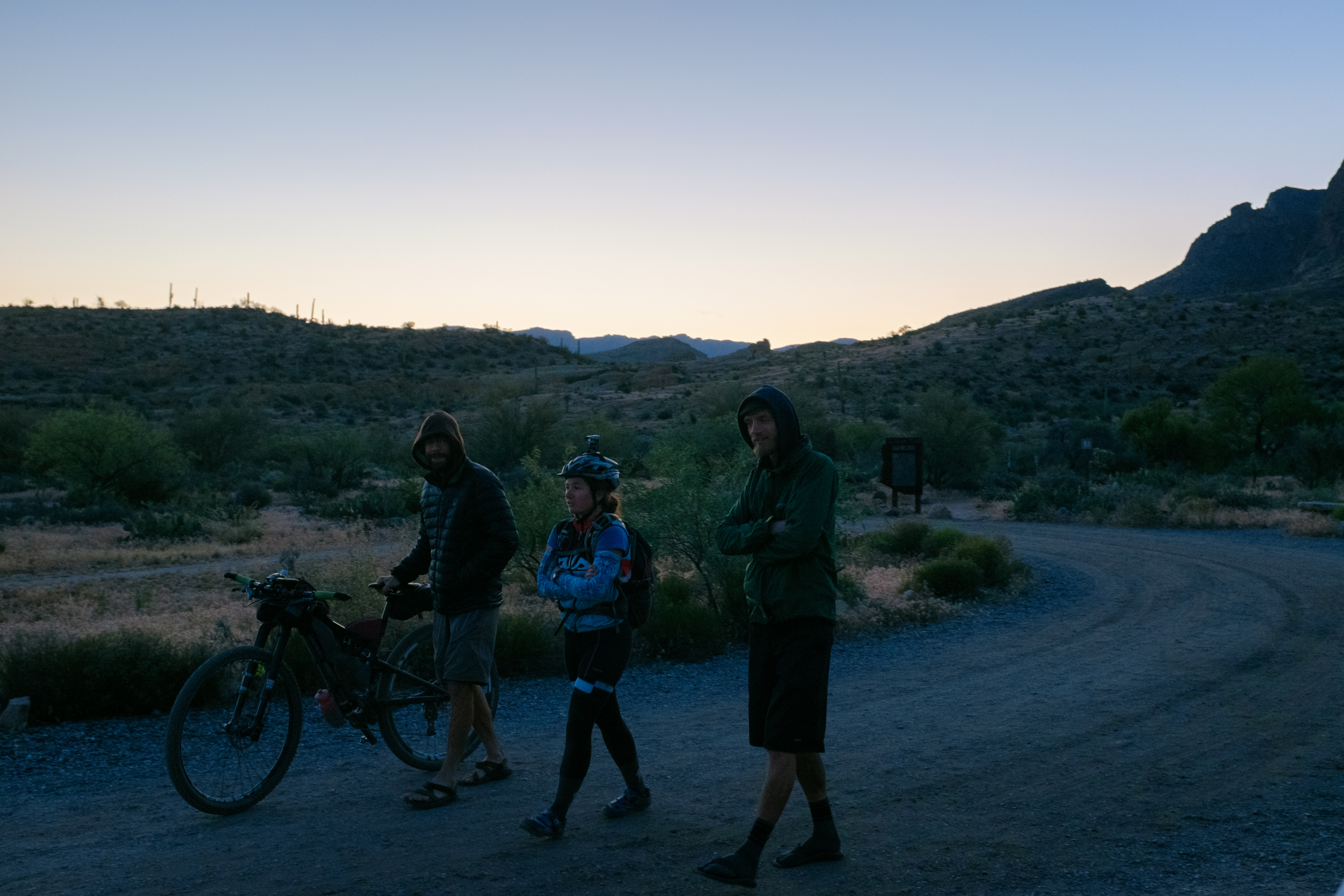 Tires crunch over the gravel at the Picket Post Trailhead. I squirm out of my sleeping bag. A group of old ladies disgorge from the SUV, and swarm the flowering cactuses with cameras. I follow them, just in case they miss something.