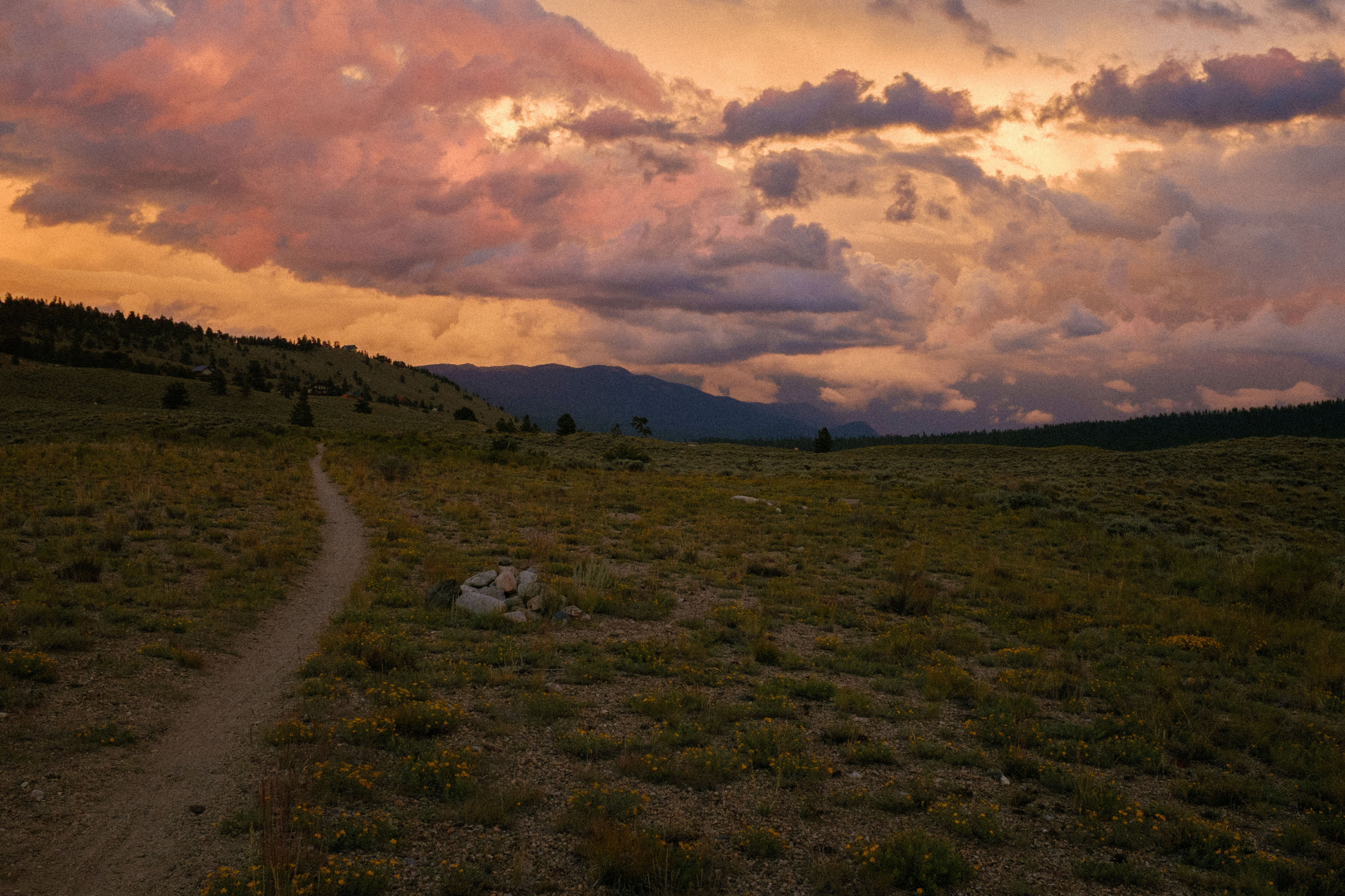 Up and moving late, at four. But maybe I could still finish in under six and a half days. Sun beat down on the Tarryall Detour, it rained, soft wet sand on the second to last segment. Six and a half days came, went. Still 20 miles left. I saw a rider coming the other way, said hello and tried to ask what the trail was like up ahead.