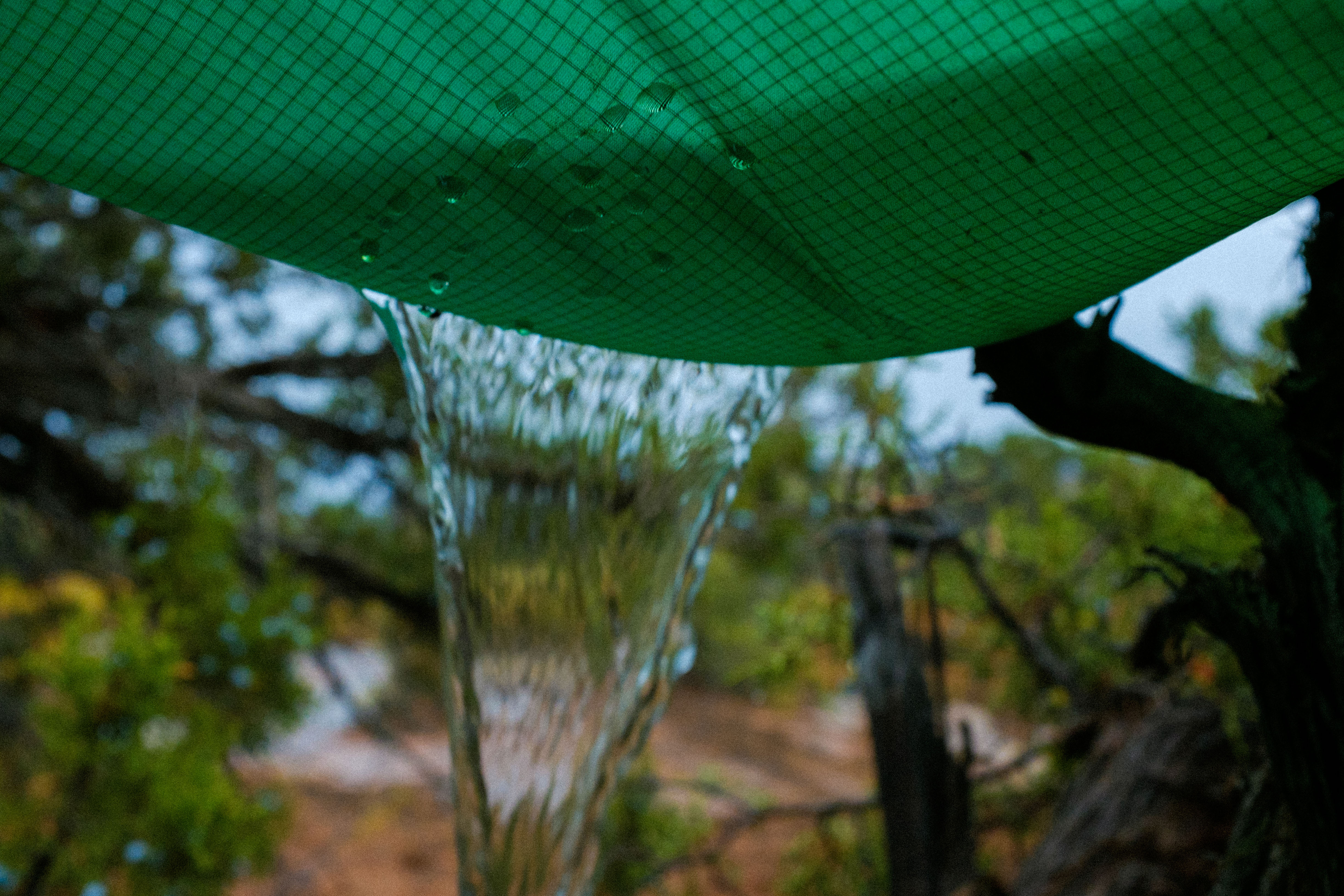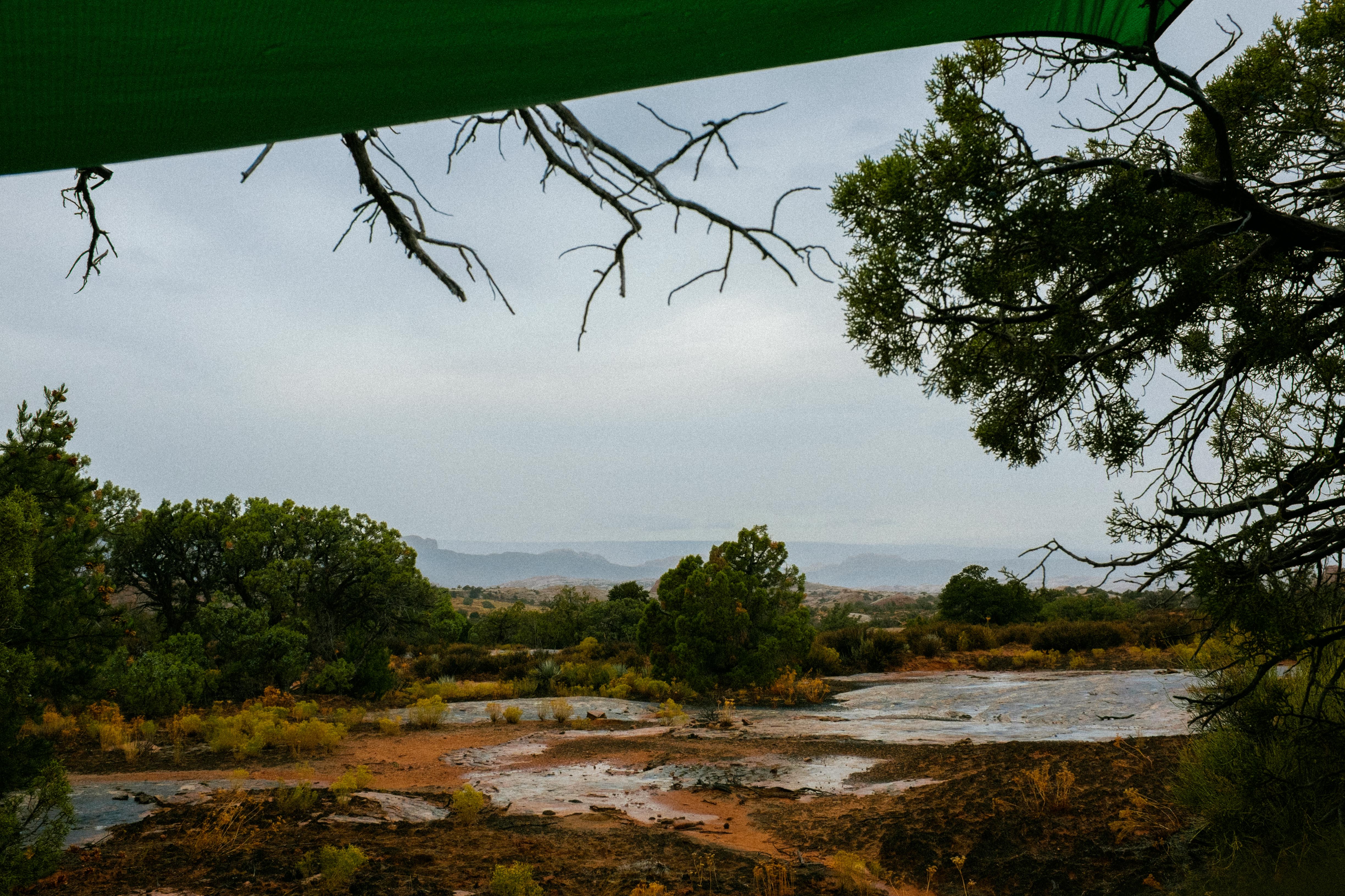 The next morning, it’s still pouring. During a quick break in the storm, I reset the tarp so that we can sit under it, and gather enough rain water off the corner to fill our pot in two big splashes.