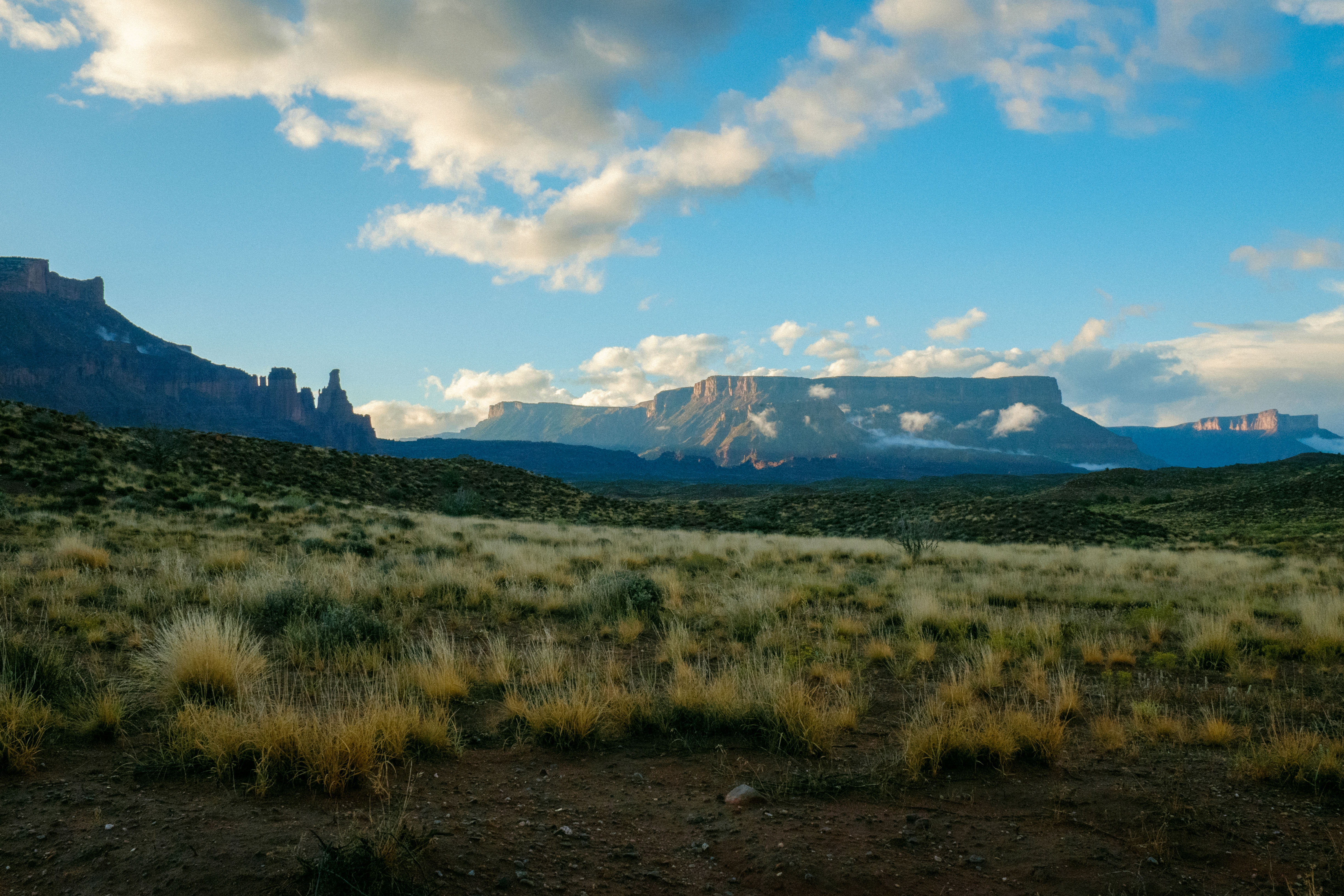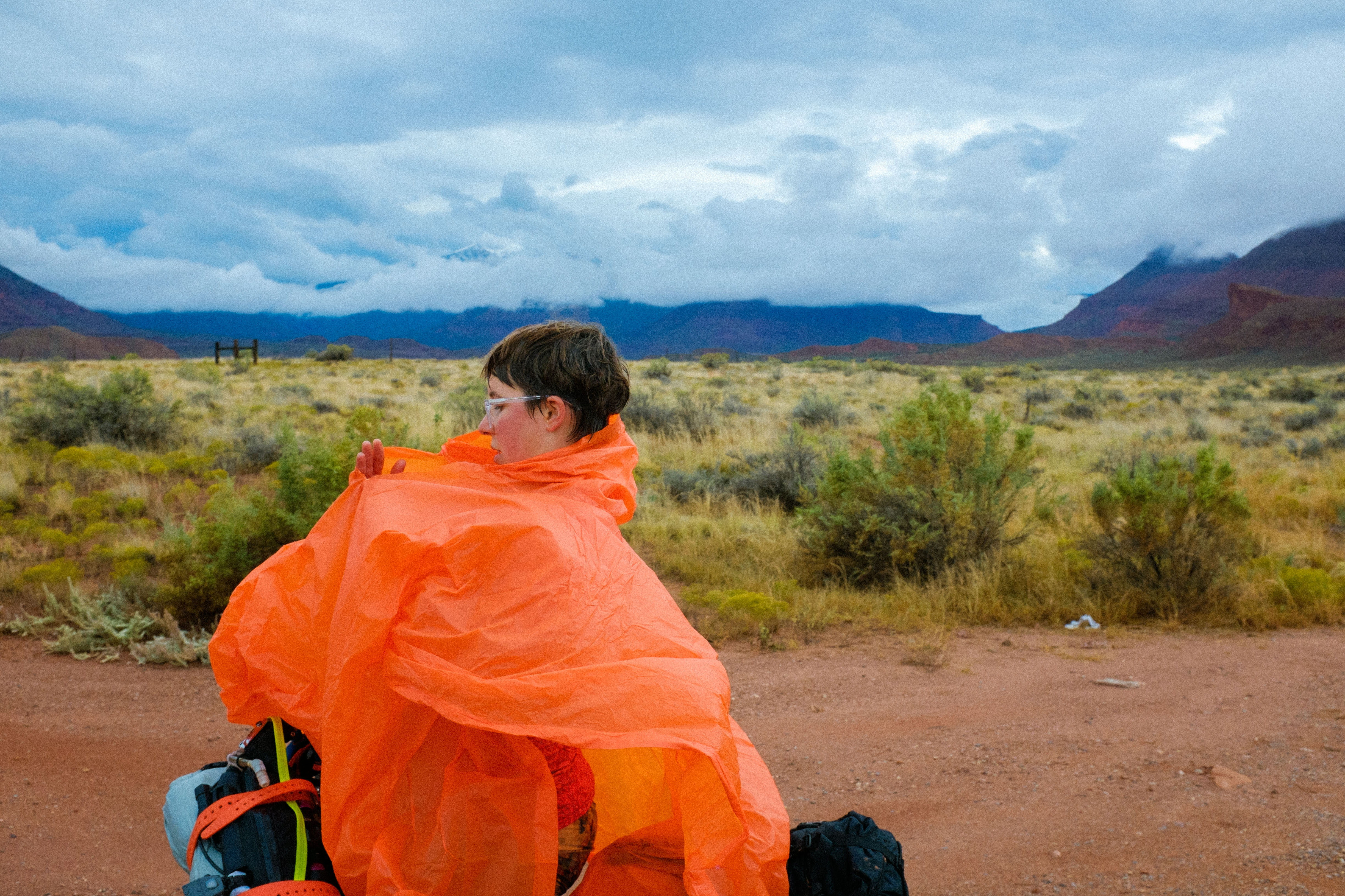 A rumble. Lightning. I roll over to look at the La Sals. My eyes adjust to the dark. There was some good moonlight when we laid down, but nothing now. Another flash. The wind gusts, and junipers creak. Oh boy. I crawl naked out of my sleeping bag and put on my riding shoes.
