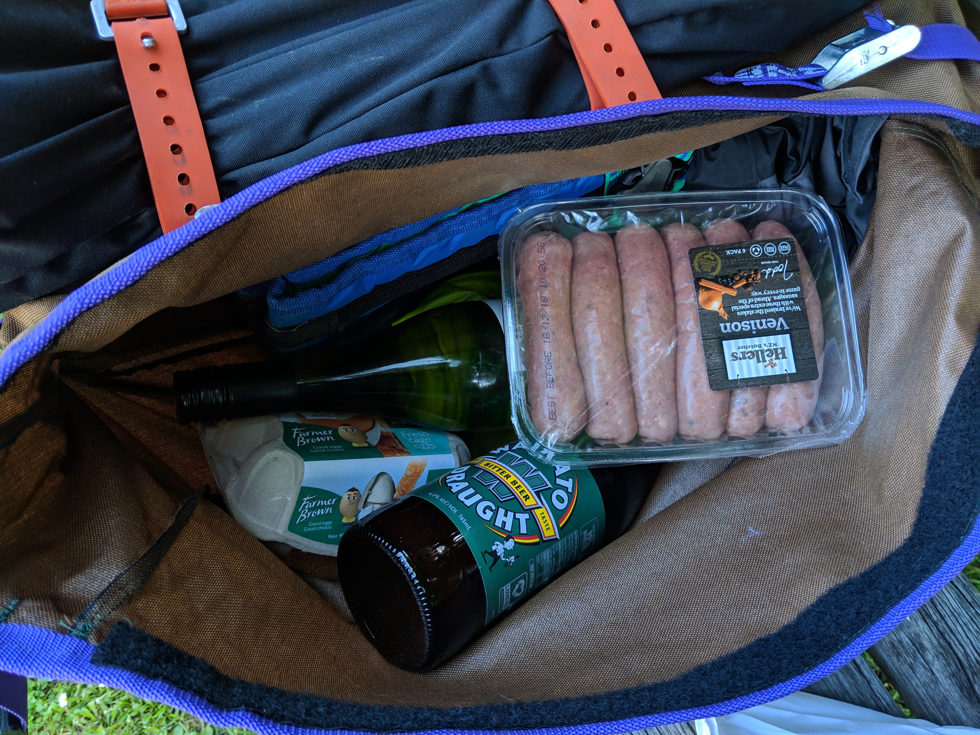 I don’t think I’ll ever go back to a giant seatbag for a long trip. These panniers have been so great. We can buy whatever food we want now- yams, loaves of bread, couple cans of beer, carrots, sausages, jars of olives, dozen eggs. Sky’s the limit baby.