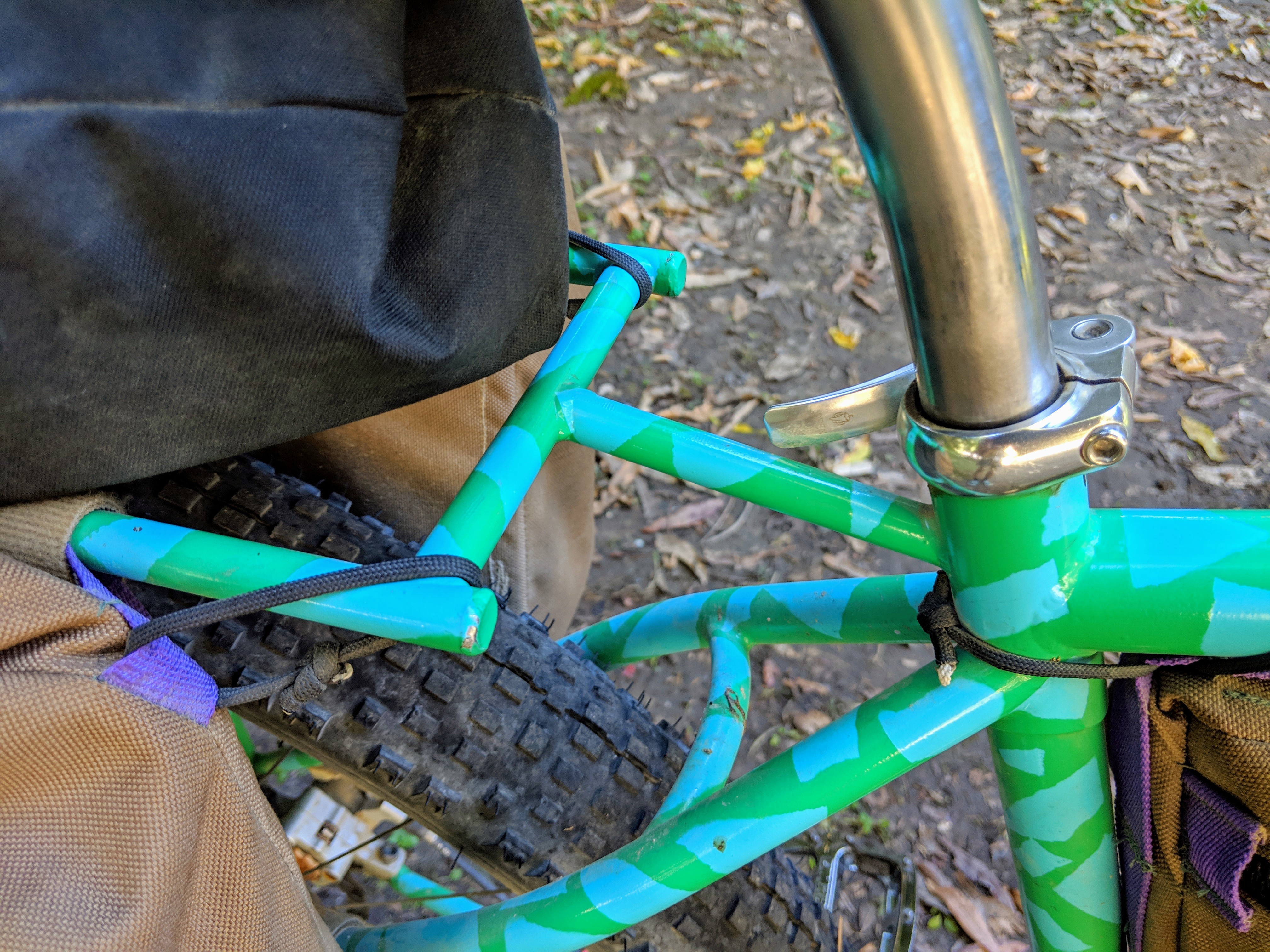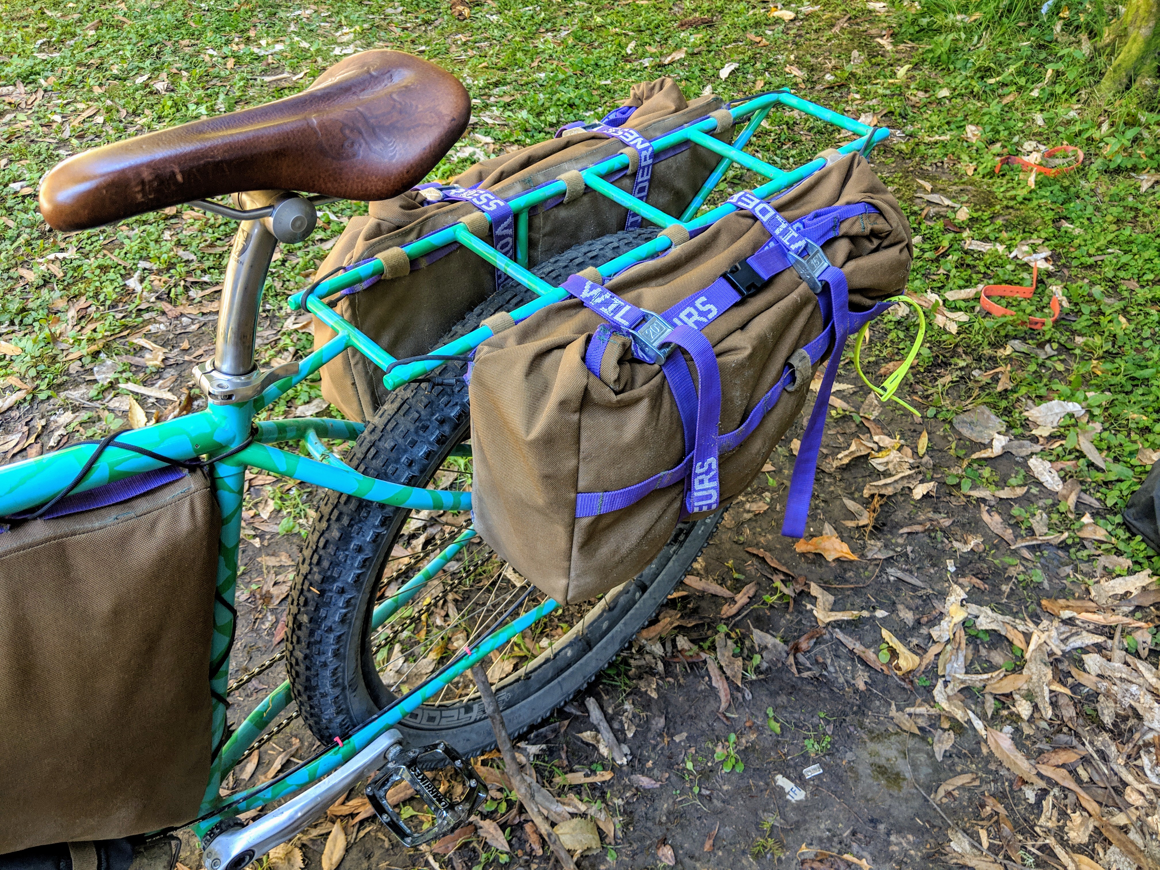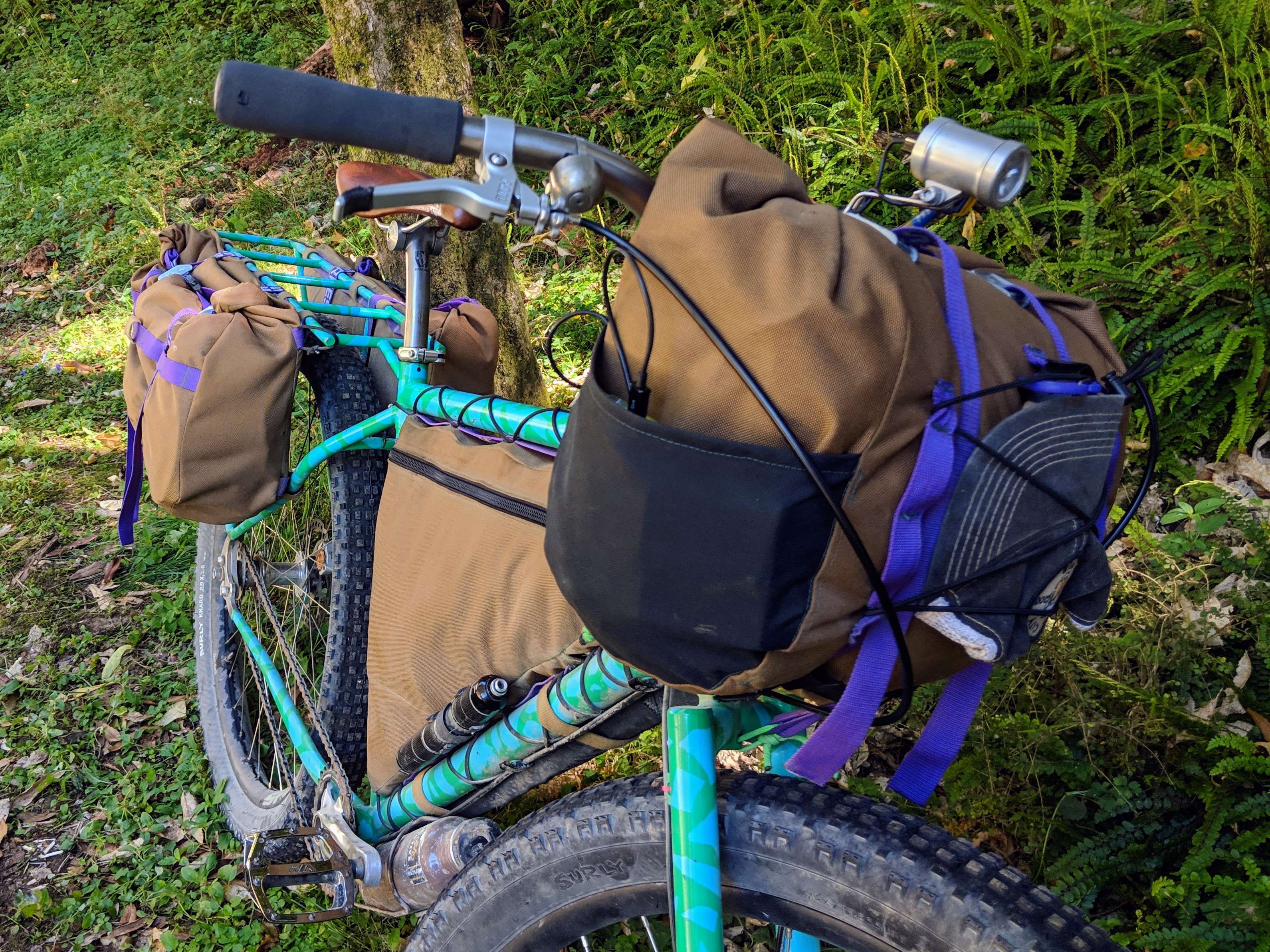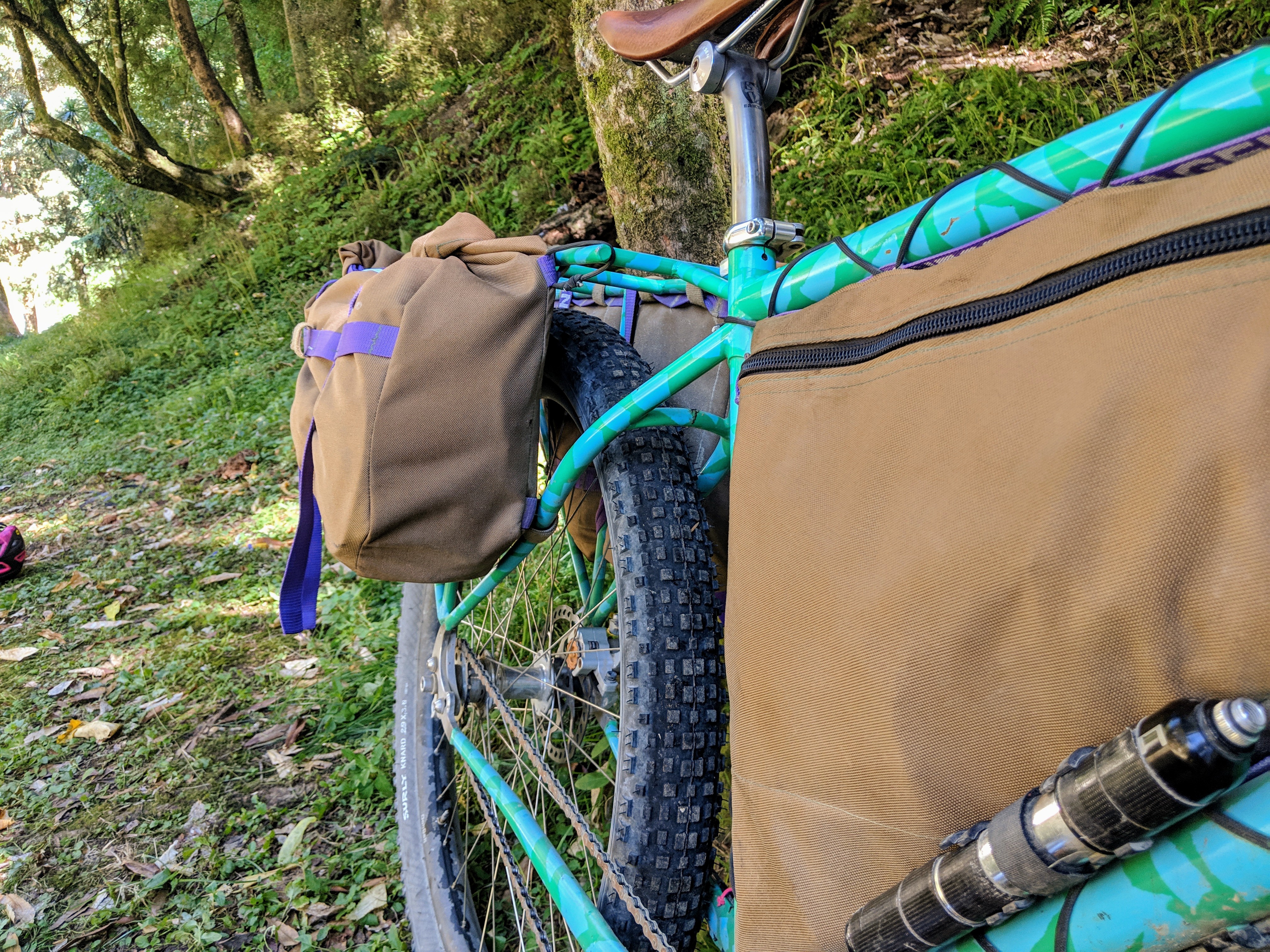 The panniers are narrow, so they don’t get in the way on a hike-a-bike, and follow the angle of the rack in the rear so that heavy stuff will always sink down and forward (weight behind the rear axle is bad). I sewed a plastic sheet onto the inside panel so that nothing bulges into the wheel. When they’re cinched down, they’re completely quiet, and completely stable.