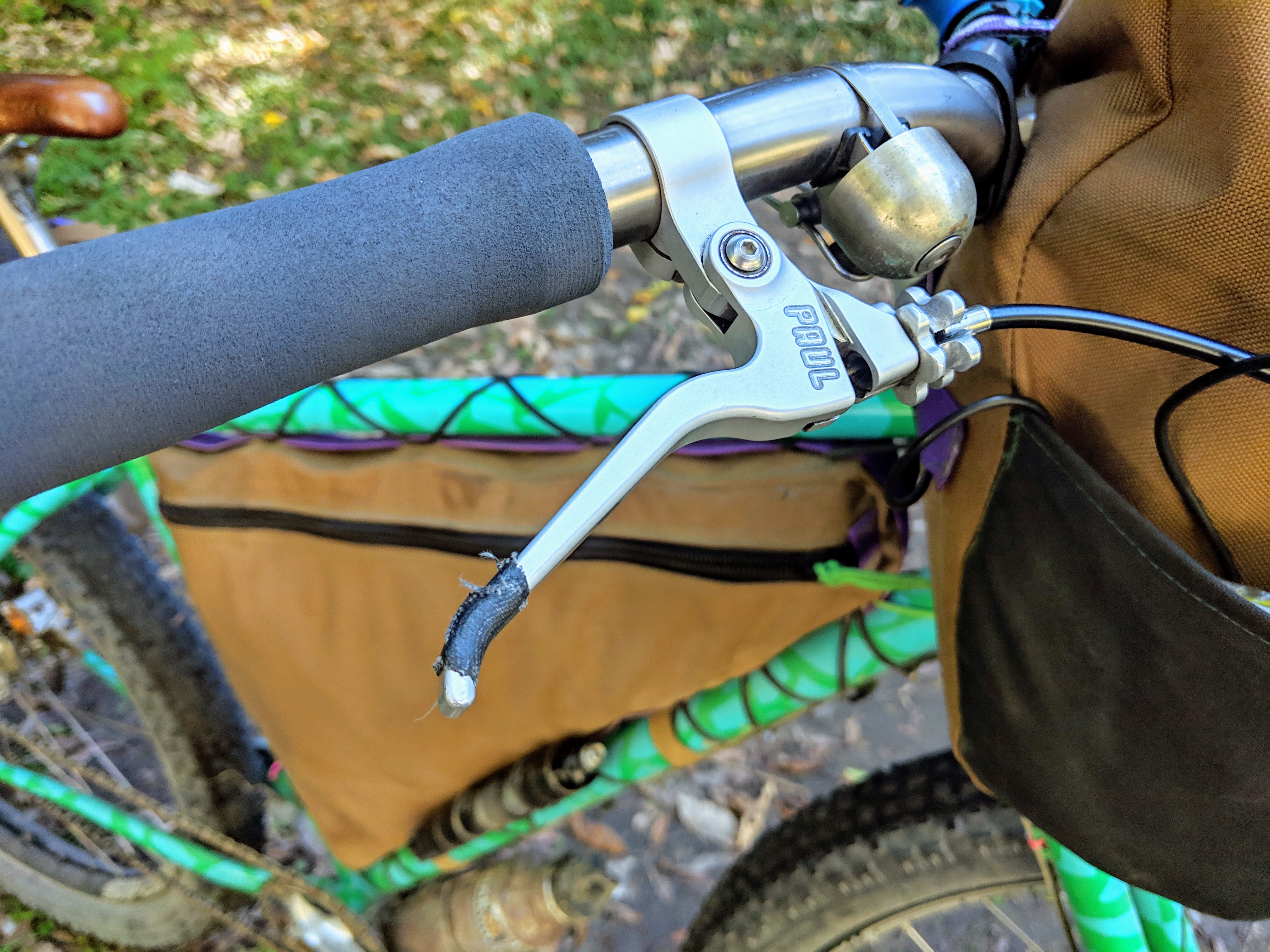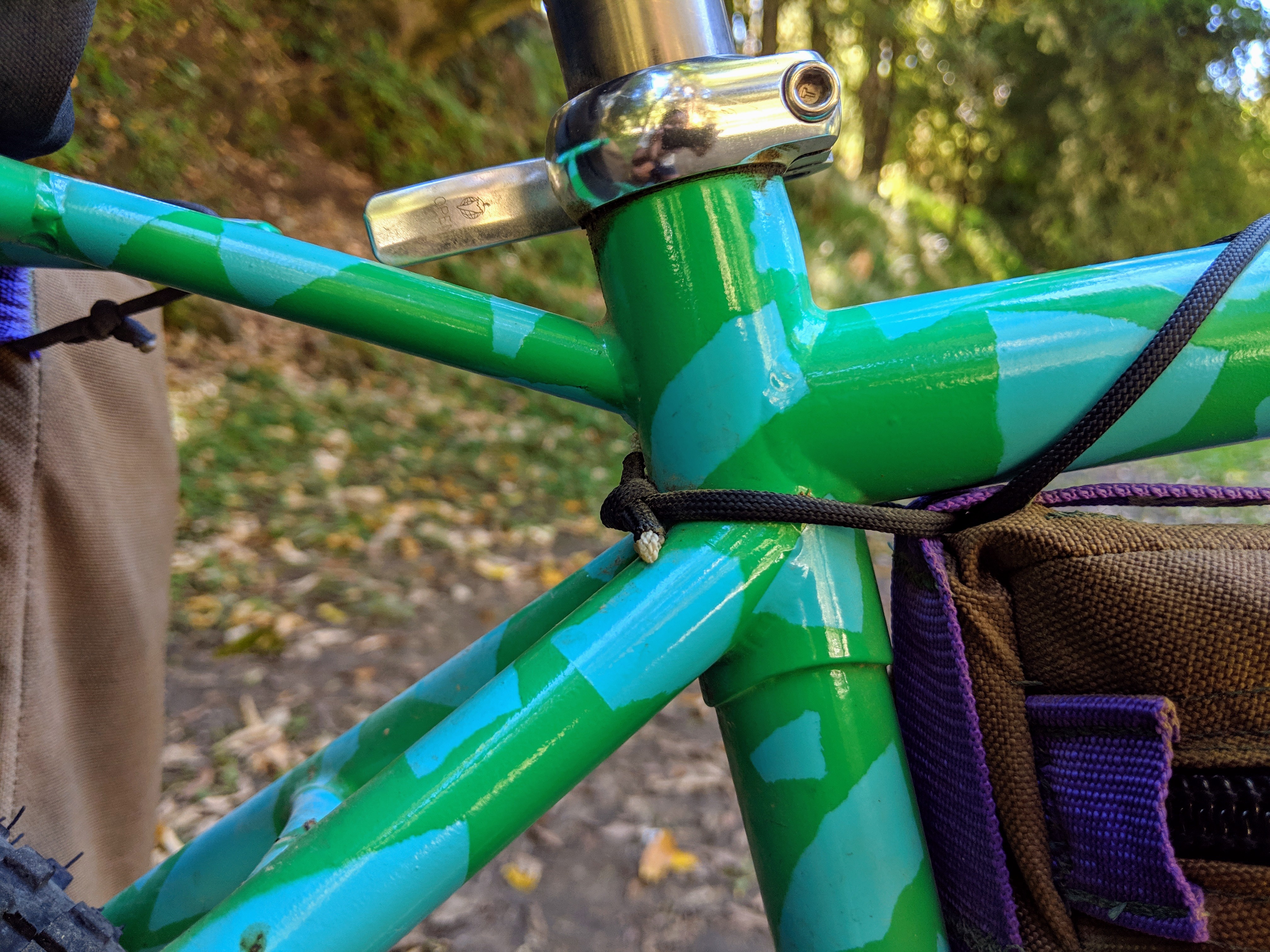 I’m so stoked with how well this works- the cam straps yank the bag up against this tab, and boom. No more shaky bar bag, I mean no movement at all. Weighs nothing, costs nothing, a good solution.