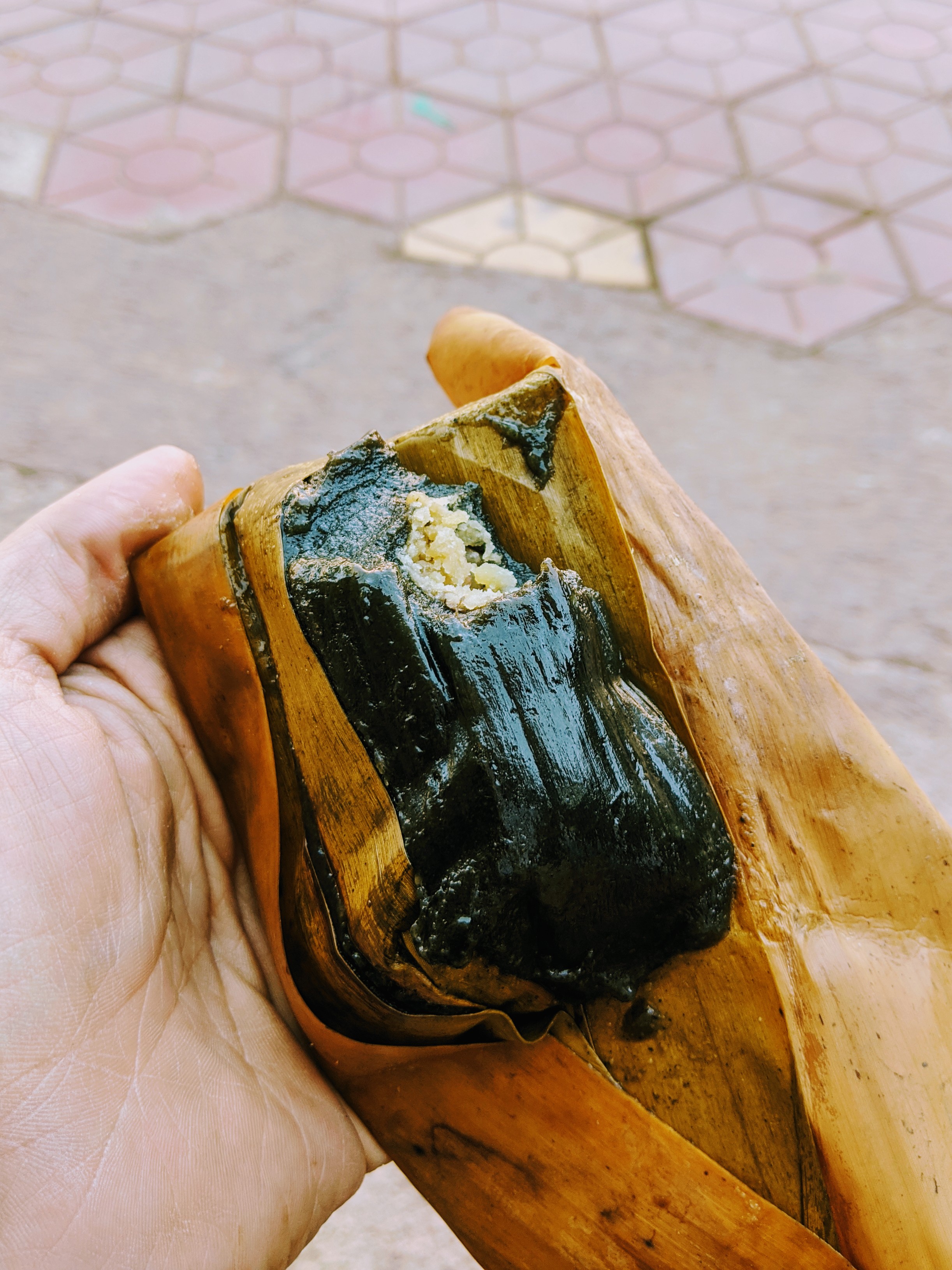The next morning, Colleen buys some mystery blocks of food wrapped in banana leaves. The old lady selling them is kinda making gestures that seem to say “are you sure you want that?”, but Colleen gets them anyway, assuming they’re some kind of sticky rice cake.