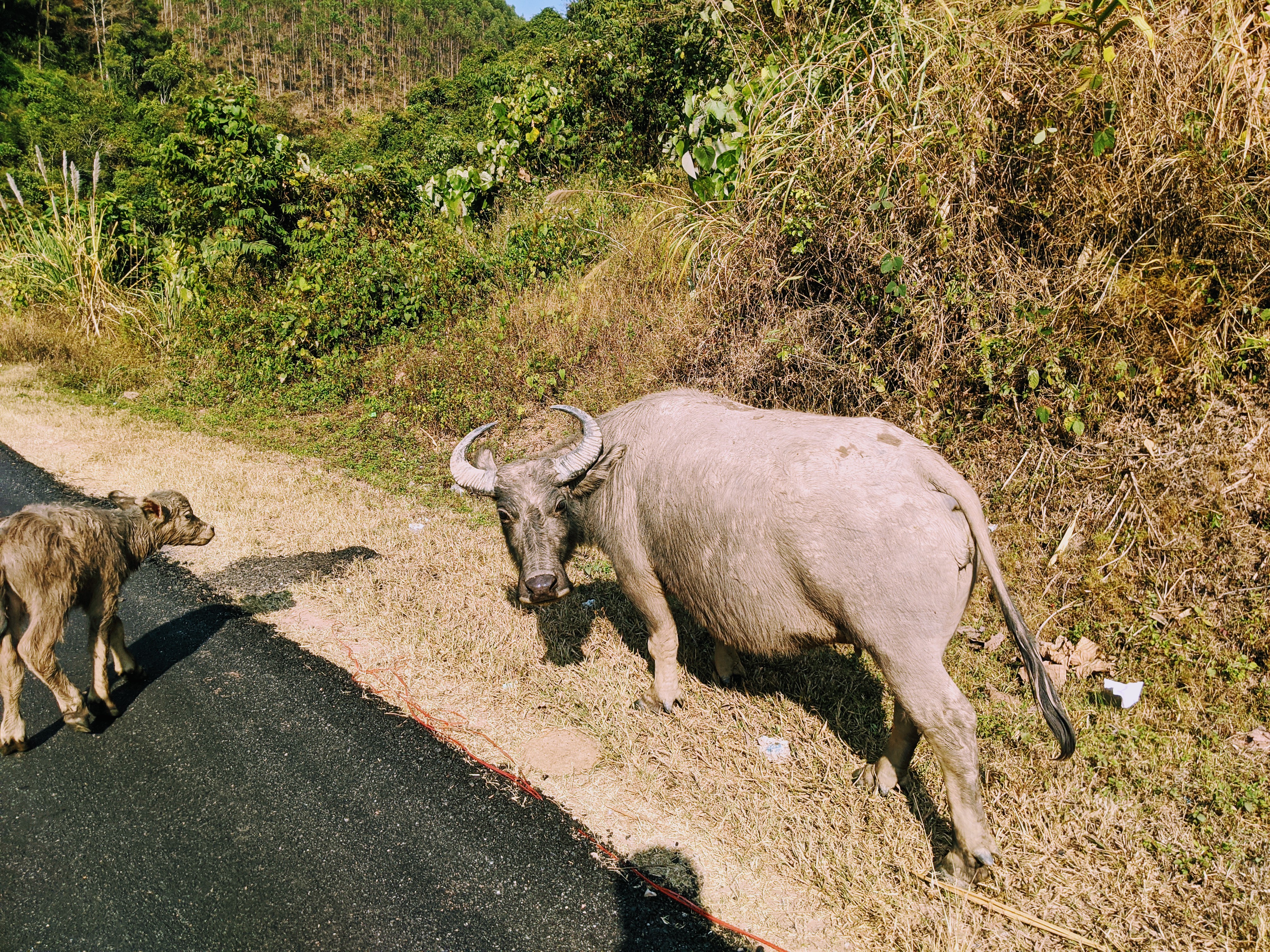 That night we end up in a bigger industrial town, and again have some dinner trouble. The street we’re staying on is a few blocks long, and seems to be nothing but oc lau, snail hotpot. Dozens of restaurants all serving the same thing, called the same thing. Oc lau, oc lau, oc lau. Hot pot is like a celebratory meal, pretty expensive and not really regular dinner. And after our experience with the baby buffalo liver last week, the hot pots and us need some time apart.