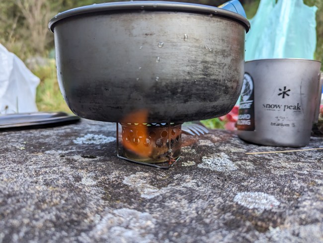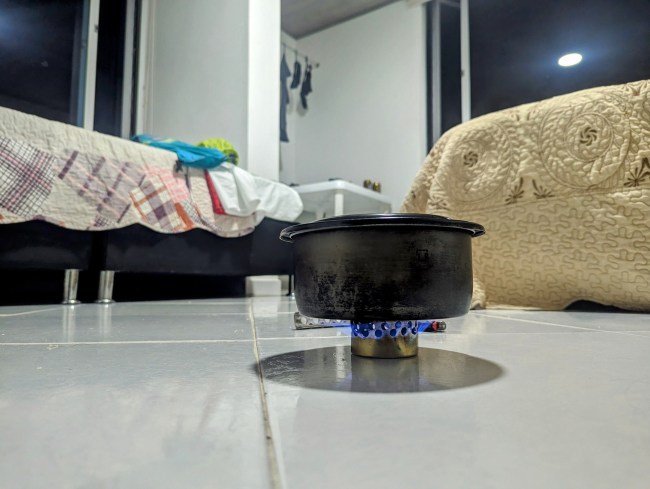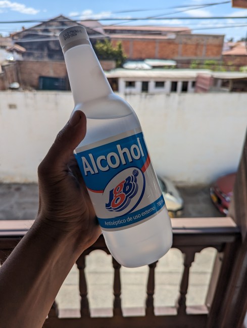 Back in Bogota we bought a bottle of Varsol “100 percent puro”, which I thought would work in our supercat alcohol stove. It burned and cooked, but the smell and fumes and smoke were terrible. It’s a petroleum distalate, not alcohol. After a little poking around we found “Alcohol antiseptico” in the drogeria (drug store). I tested it out on the hostel balcony. Clean flame, much better.