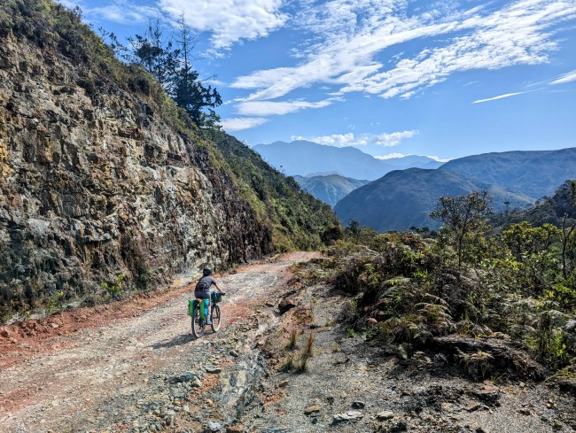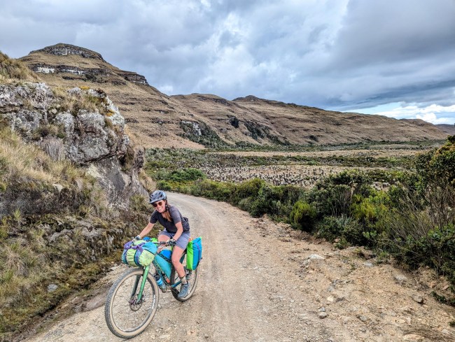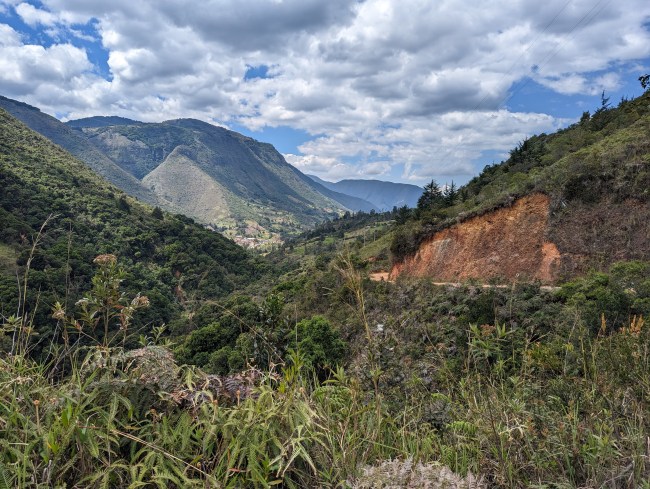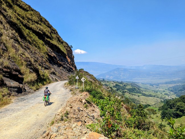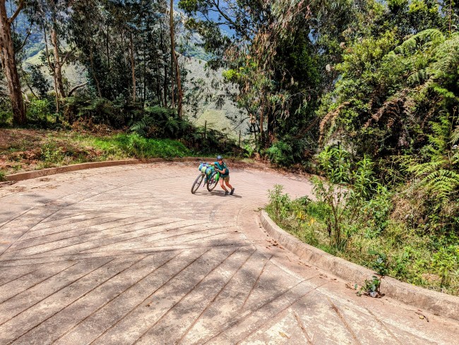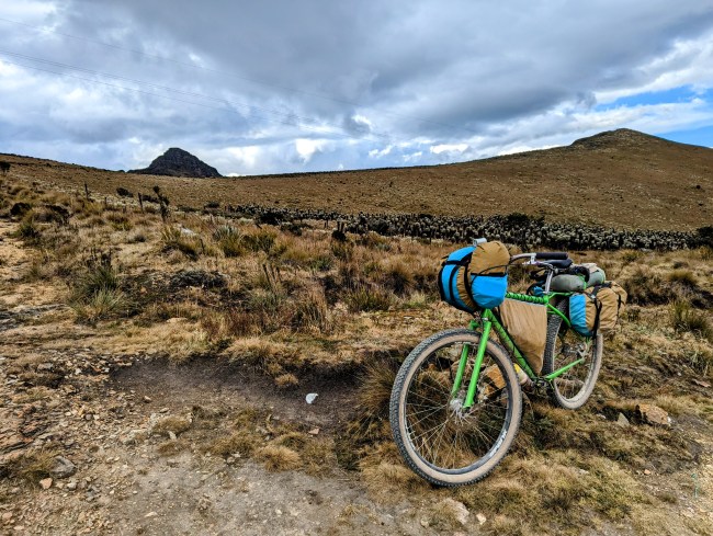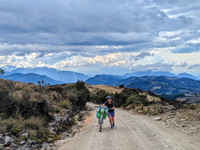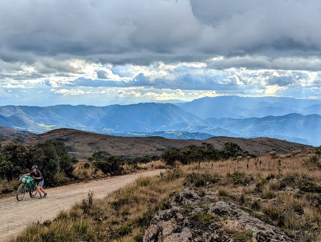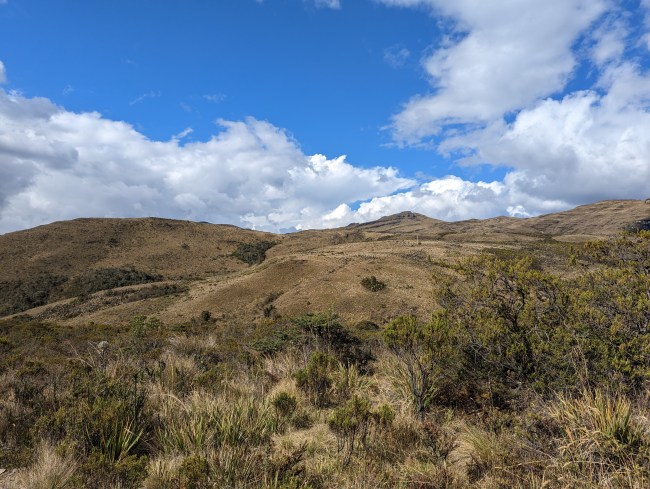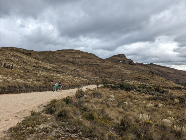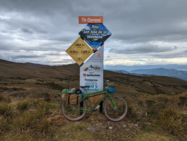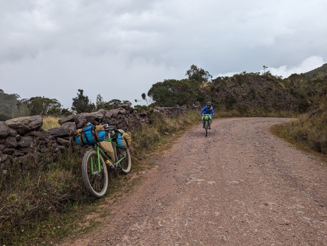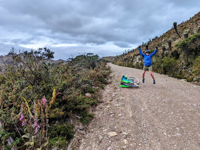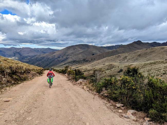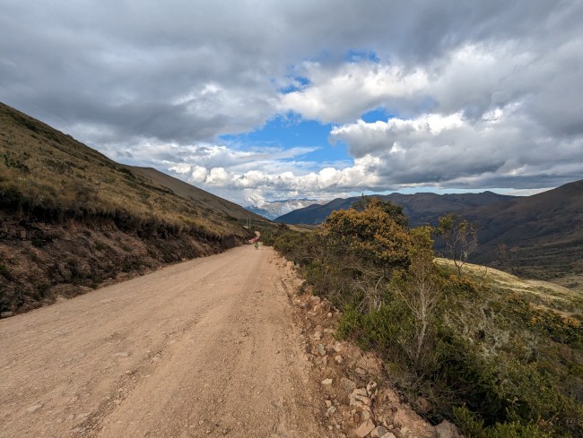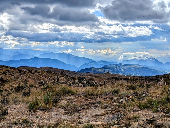 12,000- 12,600 almost there, fuck yeah frailejones, then the top, amazing view, cold fast whoosh down down down the mountain. Past a guy on a motorcycle, guy on a horse in big hat wool poncho rubber boots, steamroller, road grader, yelling potato truck, swerving pickup on the wrong side of the corner with a teenage dumbass at the wheel (not mad, been that guy).