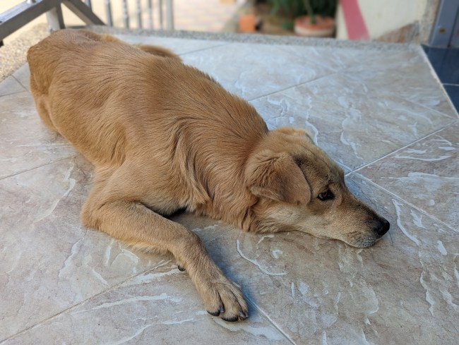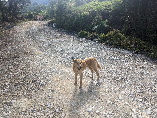 We went to sit on the dusty curb and have our snack, and a handsome yellow street dog immediately came and sat next to us. The next two days of riding look like they’re going to be the toughest of the trip, climbing all the way up to the thin air at 12600, then back down and back up again.