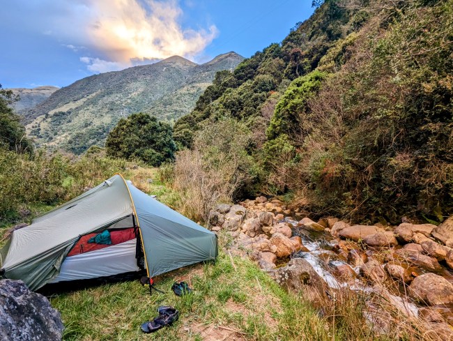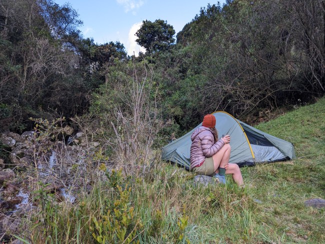 The tent spot is less flat than I thought, but we’re so tired we still pass out, sliding down into the lower left corner of the tent.