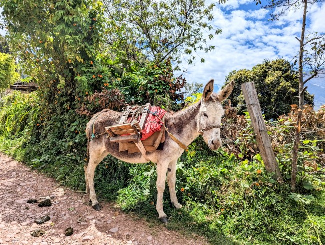 Rocky up and down descent to little Gambita. Speeding down the hill I passed two dudes on horses riding in striped ponchos and cowboy hats. Around a corner, a guy was trailing six mules up the mountain. I ended up right in the middle of the pack of pack animals before I could slow down. Shit.