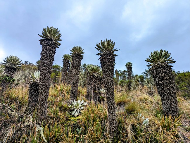 12,000 feet the scrubby shrubs are starting to thin out. Keep pushing. 12,200 we’re in the páramo. Land of the frailejones, strange little upside down palm tree trunks topped with a sage green bloomin’ onion head.